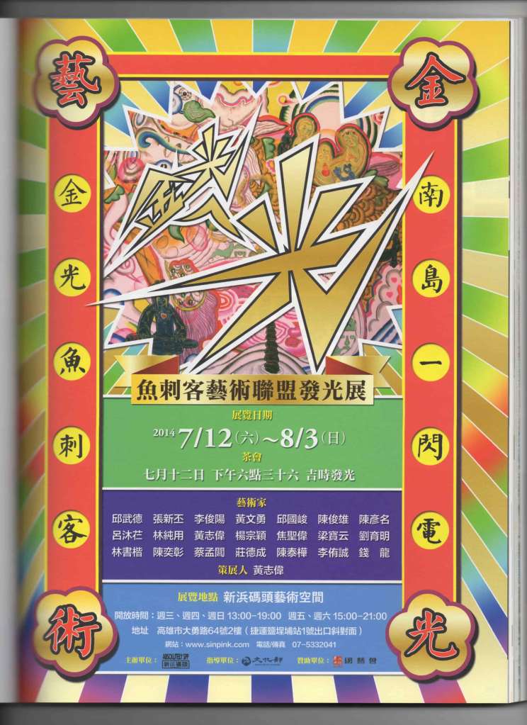 「金光之光」—高雄魚刺客藝術聯盟發光展,採命題性的提問方式,邀請高雄魚刺客藝術聯盟不同世代的藝術家邱武德、張新丕、李俊陽、黃文勇、邱國峻、陳俊雄、陳彥名、呂沐芢、林純用、黃志偉、楊宗穎、焦聖偉、梁寶云、劉育明、林書楷、陳奕彰、蔡孟閶、莊德成、陳泰樺、李侑誠、錢龍等21人,藉著他們長期在高雄批判酒桌上談藝、搞革命的魚刺客態度,來表達其個人所面對、所認知的「金光ㄟ光」,帶出專屬於自己創作脈絡對金光藝術之「光」的詮釋…「金光」可以肯定的是專屬於台灣之「光」,但不是那種背負台灣社會集體喪失自信而建構出的驕傲感的「台灣之光」,因為它僅能在這炙熱艷陽下的南島南滋養誕生,在高溫熱氣與鹹溼黏稠的環境空間高度配合下發出迷人的七彩色光。