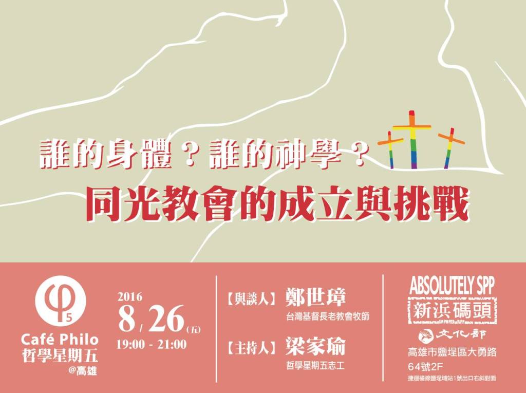 本週哲學星期五@高雄很高興邀請台灣基督教長老教會牧師鄭世璋先生,從聖經詮釋的角度,為我們解說「同志人權」與「宗教教義」的衝突與和解,以及以同光同志長老教會所面臨的挑戰。請大家千萬別錯過。