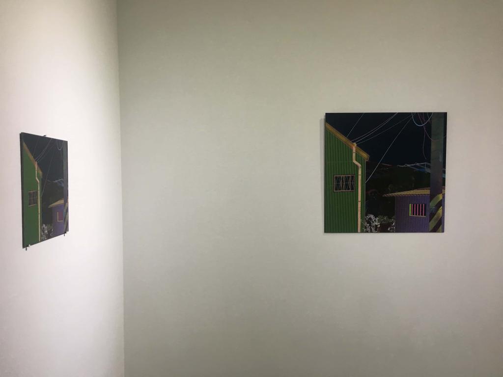 台灣的日常景色對我來說是由各異物質拼貼而成的模組化景觀,比如魔性錯落的磚牆、鐵皮屋、柵欄、植栽等,這樣無特色的有特色,使人處在辨不清方向的落差之中,也形成一種空間的「洞」的存在,這裡的「洞」並不是指真實的土地空缺,而是源自於道路的誤行經驗,使得原本心靈與視覺所知悉的場景被分割,呈現的茫然狀態。我透過數位繪圖及影像拼貼,擷取我們熟悉的建築體和物件,配以紙紮般鮮豔的色彩,重新組合成一種熟悉又無時的神經質空間。