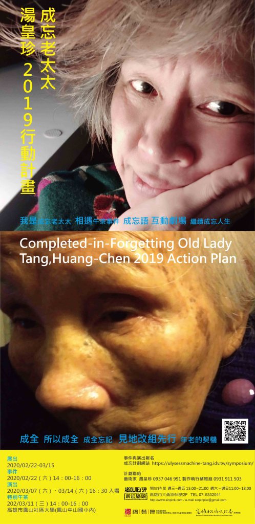 “成忘老太太,湯皇珍 2019 行動計劃”不附庸於社會服務,也 不是醫療教學,它直指人類心智的抽象轉換一來自於年老的記憶衰損 問題,從創造力的角度,從藝術無限深植的壤土,考驗人類面對異質 心智符碼轉換演繹的可能創性。