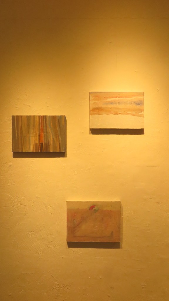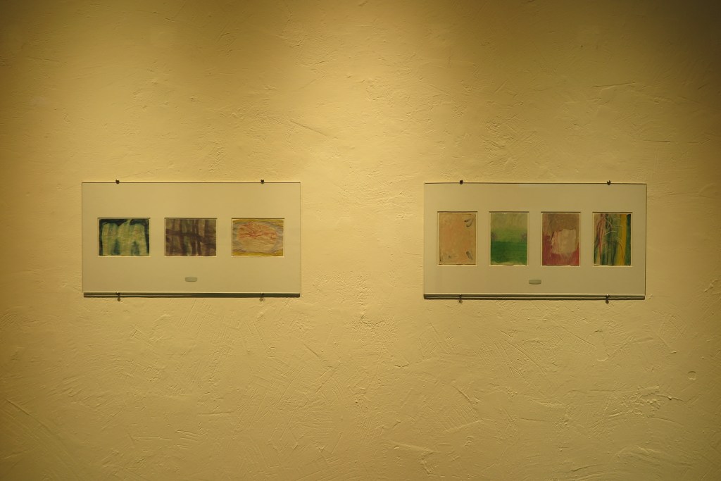 我偏愛描繪的花鳥樹木山石雲河海,和扭曲的幾何形、軟弱的線條同樣平等,在粗糙、皺摺或薄透的平面上浮現;小尺幅作品的佈置如清單的一個接一個字詞列舉,讓人困惑的並置、碰撞,串連起一個寓言式的空間,折射指向居住空間的記憶和對應生活階段的狀態。