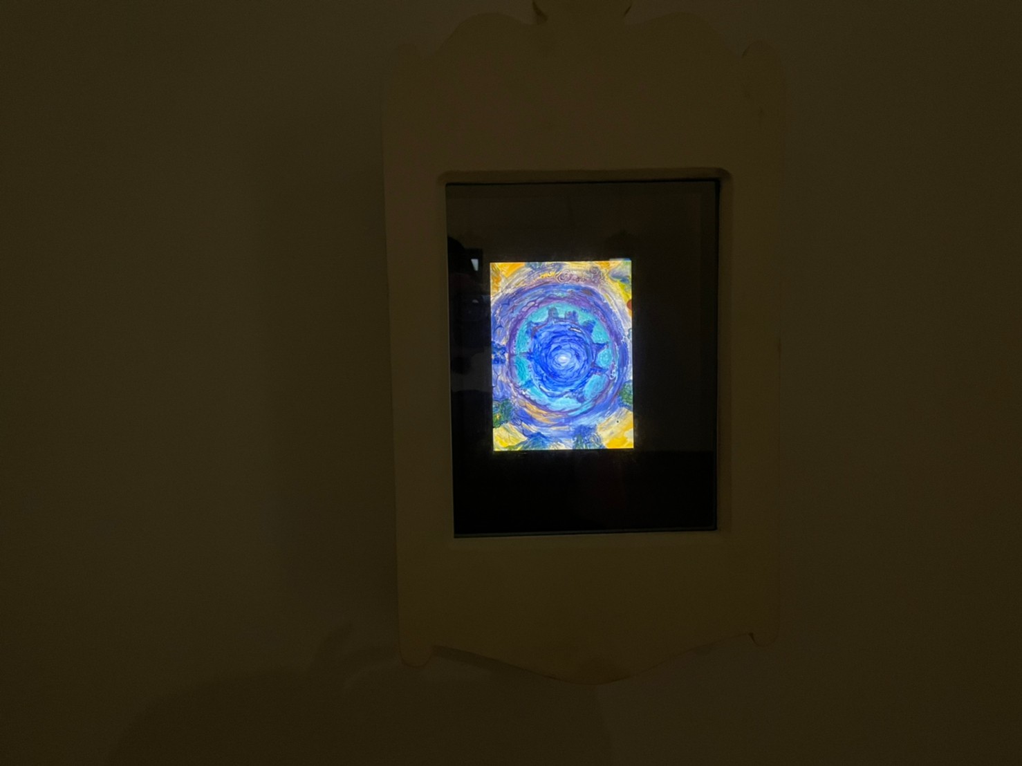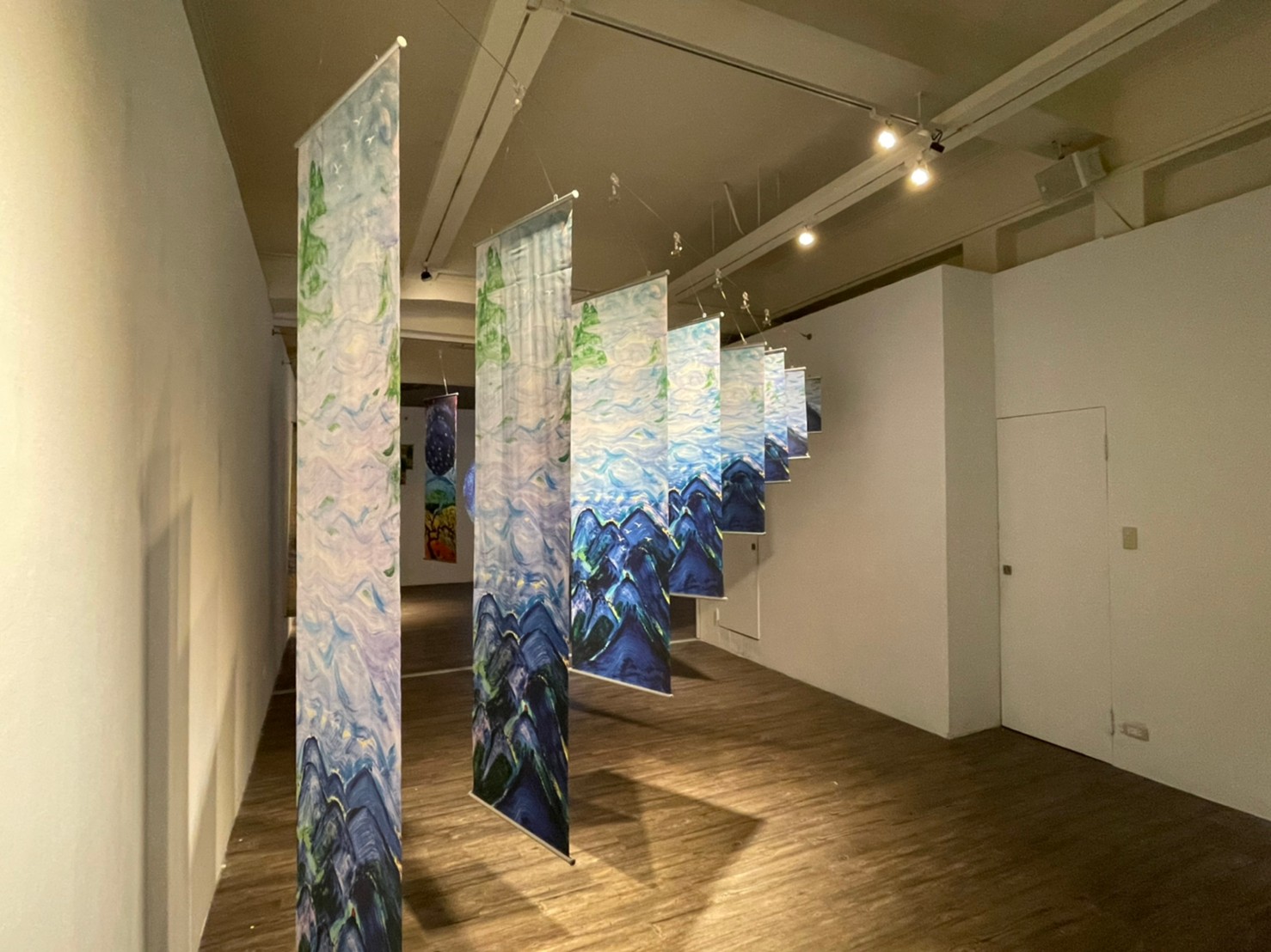 動態幻化空間呈現東西方繪畫空間的交互轉化主題,以37幅分作四行的如旛形式、按春夏秋冬色彩時序作空間垂掛裝置,佈局結合建築結構、與地面光影錯落相互輝映,既靈動亦靜謐。而「超域圖」2D動態投影於四行長短各異飄蕩的幡之終結牆面,整體俯瞰大約是「今」字型的空間安排。從繪畫裝置的身體逡巡、視覺轉換,直至幻化的圓方「超域」圖樣,動感達到旋轉結場。