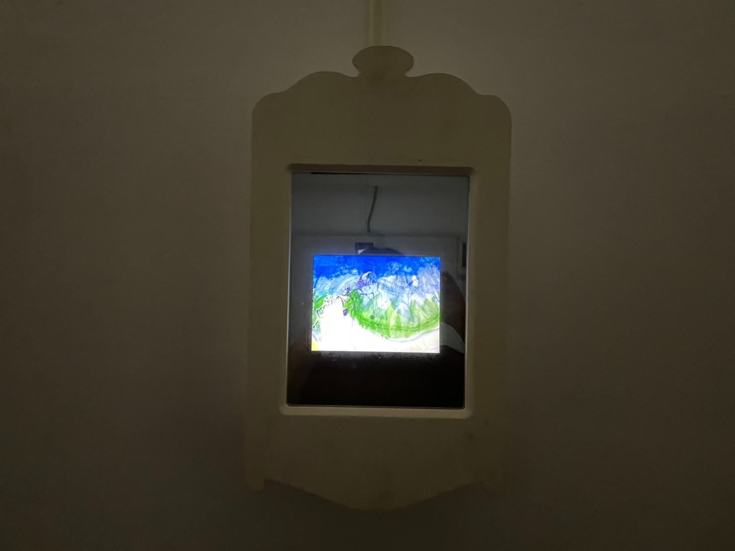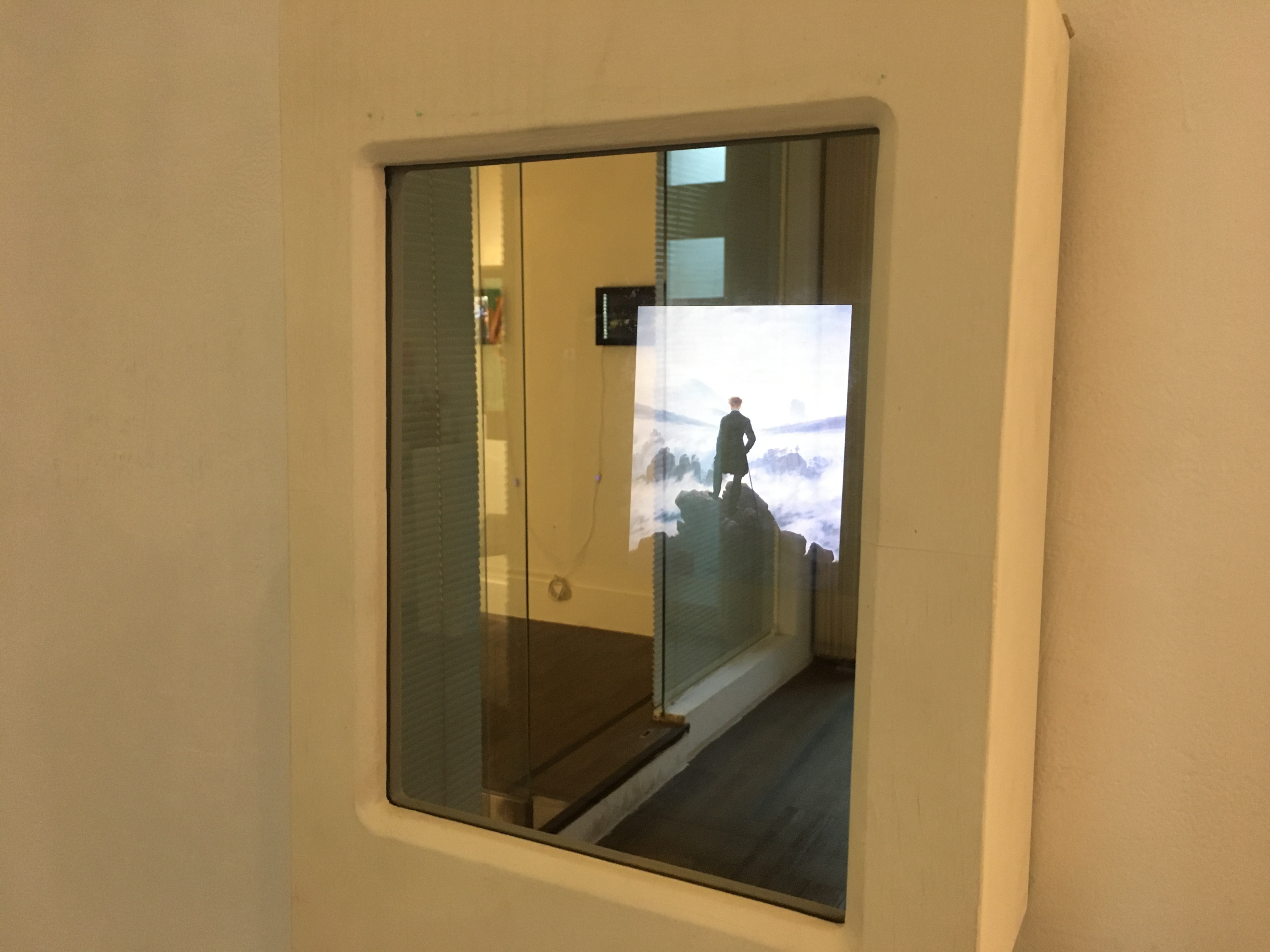 展場入門裝置於造型木盒鏡裡的動態影像~西洋畫轉化成為東方長卷軸構圖的2D動畫,為「木末芙蓉花~洪上翔個展」拉開序幕:37幅雙透布藝術微噴、另七組動畫影像、一幅壓克力繪畫及物件,安排於兩個聯通展場以空間裝置呈現。