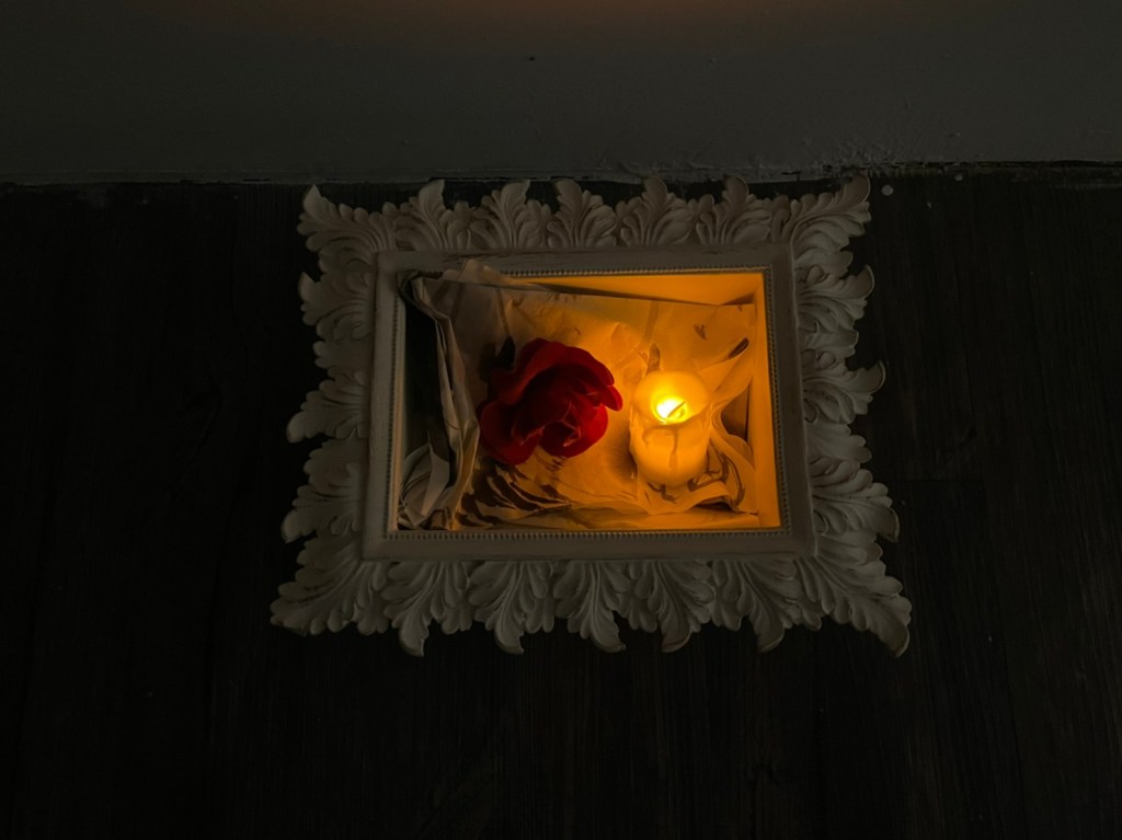 接著進入第二展場,由過道門口地面可見擬真燭光幽暗映照著地面三組物件:第一組為如深盒子般的有底畫框,其中疊放水墨線條草稿,最上置放洪玫瑰人造花與短蠟燭;第二組為紅絲絨布厚疊,上壓制卵形石頭與短蠟燭,拳頭大小卵形石繪有雙面解剖心臟圖;第三組為折疊歐風餐巾墊上置放盤形石塊與乾燥海星、蠟燭。