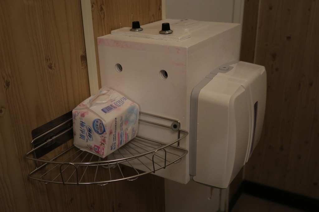 在這個展場裡,其實上廁所是非常害羞的事情,就像是一個在展場裡的隔間,隔間裡擺著可以使用的物件。為了讓使用廁所的人可以不用控制排泄力道,聲音有三個不同的音樂,你可以選擇適合的主題,順便調整大小聲,也提供各種廁所小物,衛生紙、明星花露水、酒精、衛生棉。