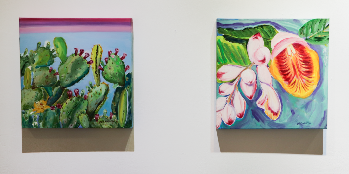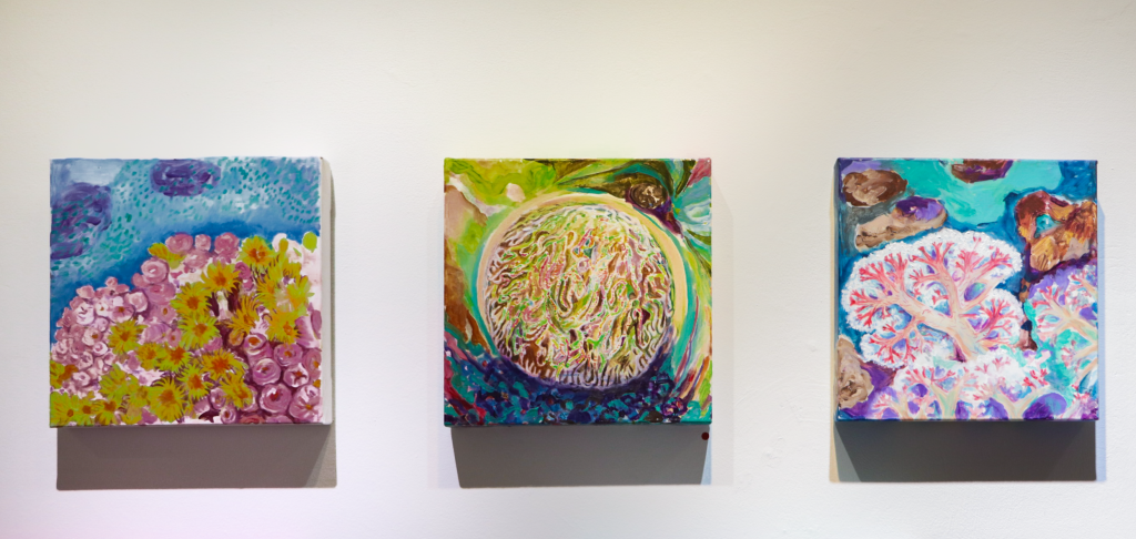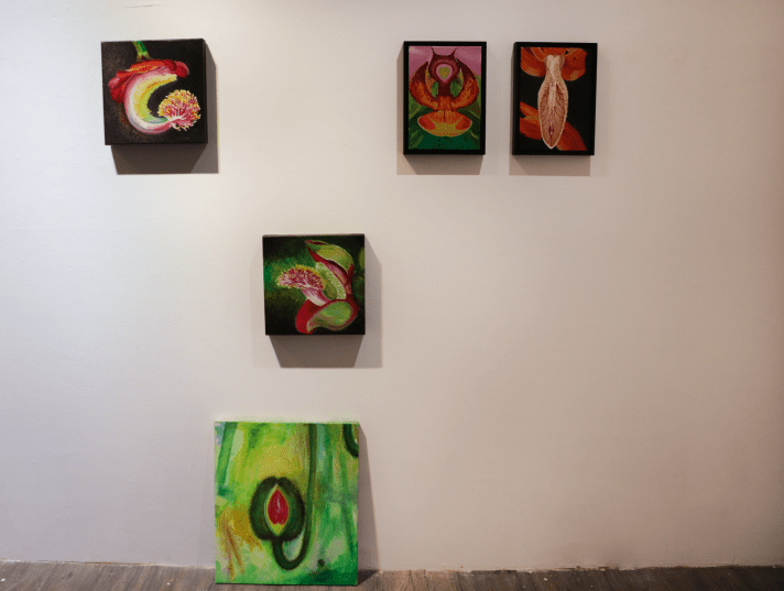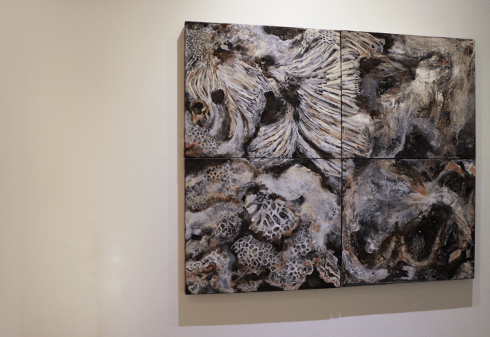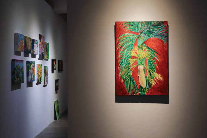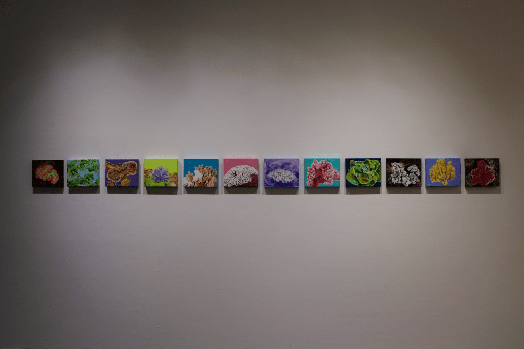 潮間帶的濱海植物以散落的根莖方式蔓延在沙洲上各自獨立卻彼此交織,成為一種特殊奇異的濱海風景。曾琬婷的濱海植物系列,便是對這樣的場景做出創作上的轉換回應。首先用繪畫帶出《植物肖像計劃》,將構樹遷徒在南島語系國家的熱帶雨林植物為思考軸心,運用微觀的視角將檳榔、香蕉(花)、仙人掌、馬鞍藤、砲彈花、獨角石斛蘭、蝴蝶蘭、乳草種莢、月桃和扶桑花等植物的局部造形形體做一描繪閱讀,表現手法以具象方式呈現,來捕捉各種植物的奇特構造、紋理和造形,雖非寫實但細節顯著,筆法筆觸活潑用色亦大膽明快,將植物的表情姿態與生命力道拉出,這一系列繪畫作品是一種對熱帶雨林植物的想像與獵奇,曾琬婷以植物的肖像命名,除了記錄與表現形體姿態,亦隱喻著植物是否也具備著靈性思維生命體的想像投射;而《島嶼地景》則帶出珊瑚礁與海底藻類的繪畫性視覺,珊瑚礁地景為台灣灣岸的特殊地質景色,她透過半自動性技法與濃稠乾凅的筆調,來表現這一化石地景的質地張力,略帶溼氣的乾燥粗曠,灰黑土黃汙濁的色澤與條狀層疊排列和珊瑚坑洞,共同結構出此一地景的歲月足跡,為滄海桑桑、潮起潮落的自然塑造,書寫抒情的悲愴詩篇。
