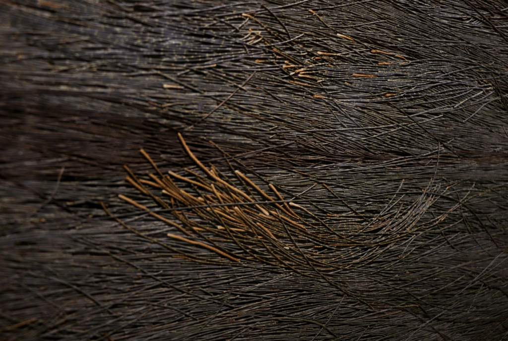 林投樹為台灣常見的海岸林帶植物,是長久以來南島族群日常生活中各類器物的重要植物材料,其葉片具有三面倒鉤尖刺、深具韌性且不易處理之特性。在過去物資缺乏的時代裡,林投是一種被用到非常極致的植物。從閩南、客家人到原住民族皆有食用的記錄。阿美族人剝除葉片取出嫩芽食用林投筍,葉子去刺後編織成小籃子放入糯米豬肉煮熟是為「阿里鳳鳳」(Alivongvong),是族人外出採集狩獵的便當。恆春滿州一帶甚至於蘭嶼的居民則將炎熱的夏天將林投果煮成消暑的飲料,而林投不定根的長纖維則讓達悟族人得以將其曬乾後搓揉成繩子用來串飛魚;客家人亦取用林投纖維來編草鞋。這些利用林投植物特性的使用範例,讓曾琬婷著手行動臨岸採集,不同的是她將葉片的尖刺保留來進行編織,讓林投的原始樣貌全然顯現,透過身體性和手屬性的編織手段來經驗的荊棘植物,也將其材料特性與視覺裝置共融合一,並試圖在慣性文化下的十字交錯編織手法中,重新經營出某種錯落無章之新舉(矩),來呈現出不悅目卻深植人心的《荊棘風景》。