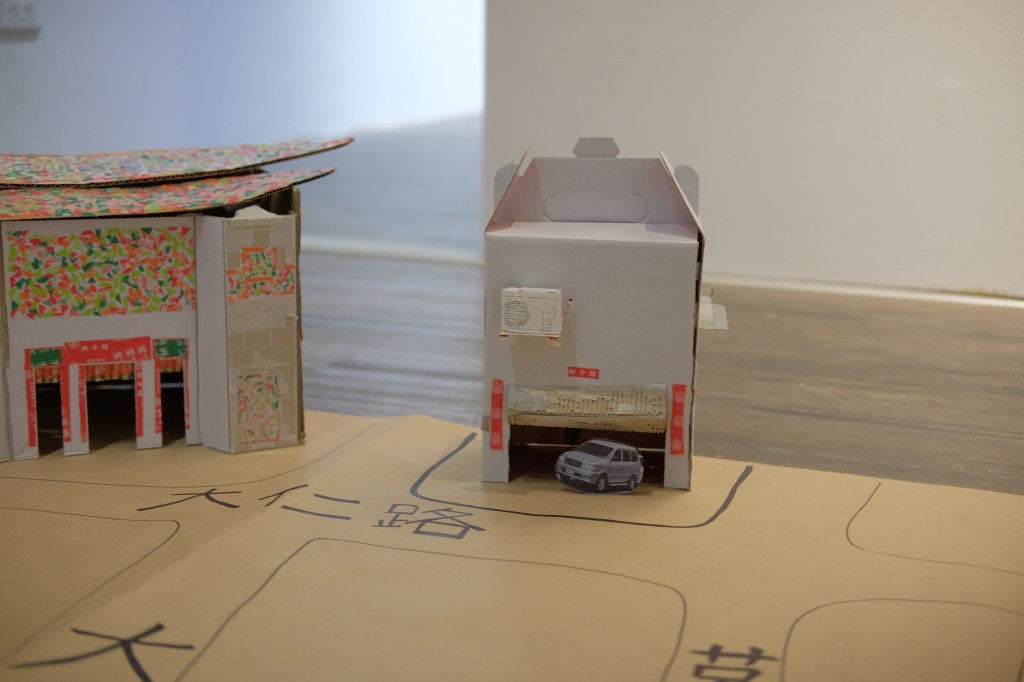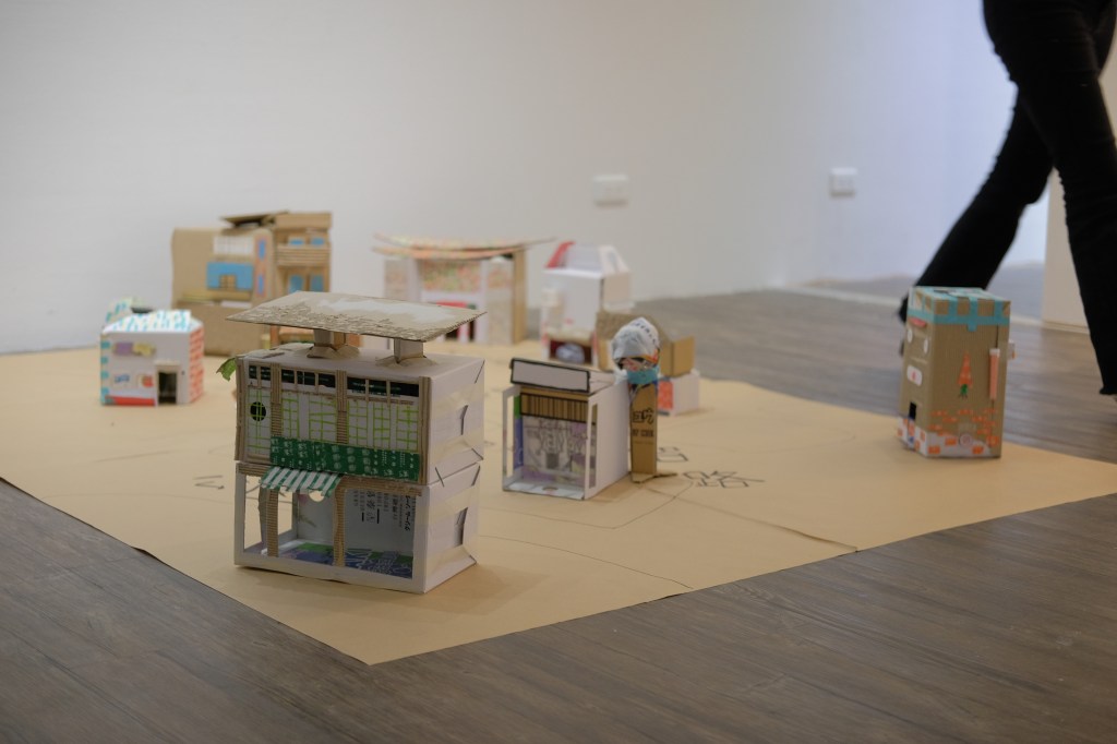 透過組織保衛隊的形式,進行街區走讀,引導孩子們認識鹽埕的歷史脈絡,以及觀察房子的造型特色,並蒐集市場裡的商家廢棄紙箱、包裝紙等作為材料,共同創作出地圖和建築。