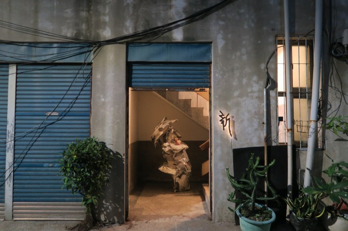 新浜碼頭沒有碼頭,來第二次場刊的那天發現招牌不見了。原來十月颱山陀兒把招牌吹走了。當下覺得碼頭應該要有自然光,但沒辦法這裡已經是白盒子。離開前想起新浜倉庫好像有個後門,看了一下原來在被堆滿雜物、畫作、木箱的背後是藍色的鐵捲門。跟我老家一樣門的左右有兩個小卡榫需要手動拉起。當拉起鐵門的那刻有總回家的感覺。歡迎光臨 いらっしゃいませ,咖啡雅座、殘留物、污痕、地板、樓梯、招牌、發光體、假石頭、紙箱、回音、必忠街168巷。於是我們發現新的進入新浜的方式。關於認知更新只是想對既有的事物重新觀看、重新理解。最後,腦海響起新朋友阿宇慵懶的聲音:年底了就是想中場休息一下呀。來吧來吧~~坐一下吧。