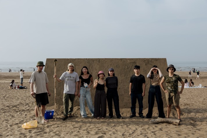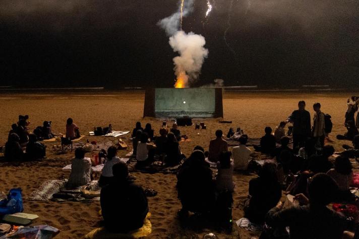 他們亦反思到新媒體時代的傳播機制,質疑「新」的真正意義,試圖在數位環境中尋找錄像藝術的新可能性。與此同時,他們拒絕預設立場,強調保持彈性與機動性,避免落入既有的藝術話語框架。最後,他們提倡藝術家應該自主建構放映平台,而非依賴於機構與資本體系的支持,進而實現真正的去機構化。「錄像游擊隊」的行動不僅是一場藝術實驗,更是一場對影像藝術在當代處境的深刻批判,他們的游擊宣言即是對當前藝術生態的一次直接介入與積極行動。2024年3月24日晚間,在沙崙海水浴場,「錄像游擊隊」展現出成立宣言的行動力,展開第一場放映行動,亦開啟了台灣第一場在海灘展映錄像藝術作品的先例。這樣「搶灘」的策略,有別於過去藝術家陳界仁或高俊宏重返現場的放映實踐,「錄像游擊隊」主要聚焦於展呈形態上的挑戰,也誠如團隊宣言中的主張—解構框架、自由展演與去機構化。除此之外,值得一提的是,這次的放映展呈介面,雖然使用了白盒空間常見的木作片牆,不過團隊相當敏銳的回應限地特質,將海灘沙泥塗抹於投映銀幕,強化了這次行動實踐中的藝術價值,而在其中參與的藝術家蔣雅媛,放映完〈永存之地:綠洲〉(2024)作品,接續著身體行為所施放的煙火,可進一步延展為一種搶灘告捷後的勝利凱旋。