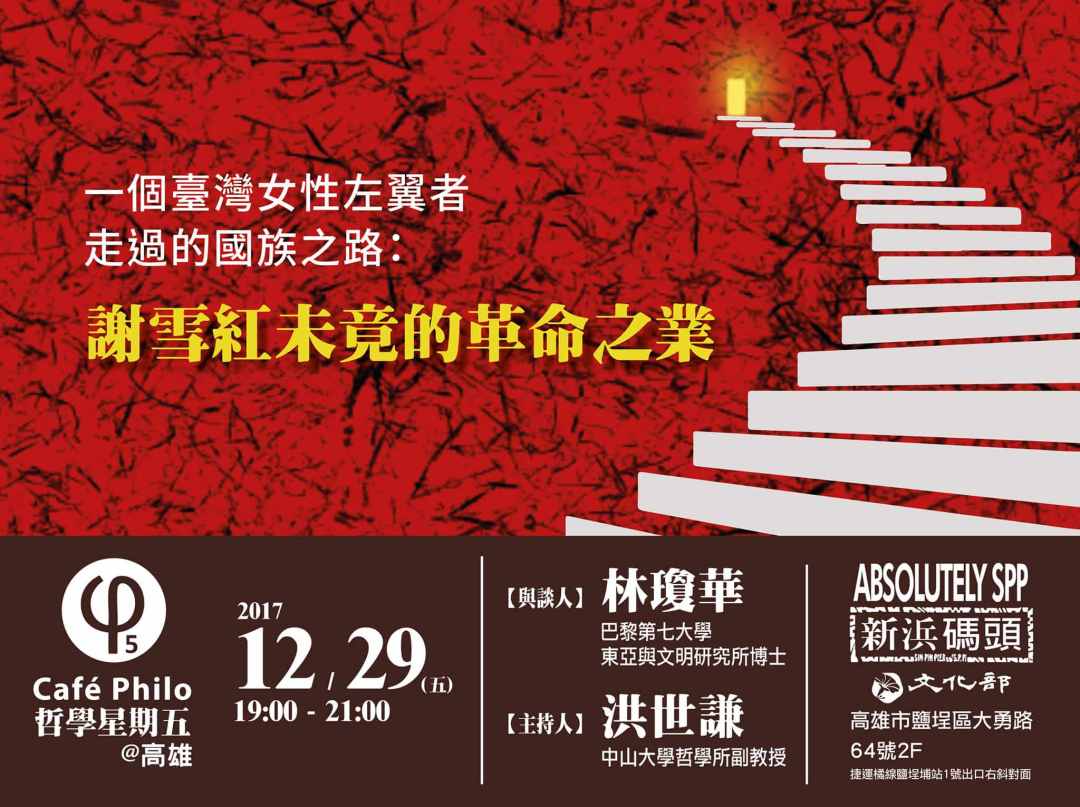一個臺灣女性左翼者走過的國族之路:謝雪紅未竟的革命 【哲學星期五@高雄】 【與談人】林瓊華|巴黎第七大學東亞與文明研究所博士 【主持人】洪世謙|中山大學哲學所副教授 【時間】 2017 年 12 月 29 日(五)19:00 ~ 21:00 【地點】新浜碼頭藝術空間