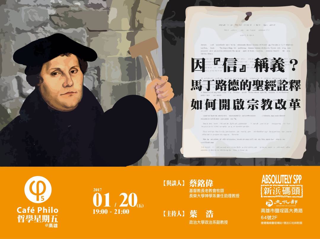 「因『信』稱義」?馬丁路德的聖經詮釋如何開啟宗教改革? 【哲學星期五@高雄】 【與談人】蔡銘偉|基督教長老教會牧師;長榮大學神學系兼任助理教授 【主持人】葉浩|政治大學政治系副教授 【時間】2017 年 01 月 20 日(五)19:00 ~ 21:00 【地點】新浜碼頭藝術空間