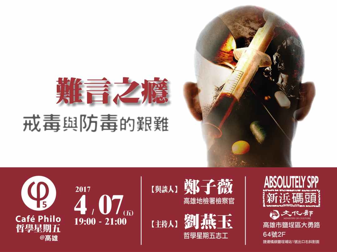 難言之癮:戒毒與防毒的難題 【哲學星期五@高雄】 【與談】鄭子薇|高雄地檢署檢察官 【主持】劉燕玉|哲學星期五志工 【時間】 2017 年 04 月 07 日(五)19:00 ~ 21:00 【地點】新浜碼頭藝術空間 【主辦】新浜碼頭藝術學會、哲學星期五@高雄志工團