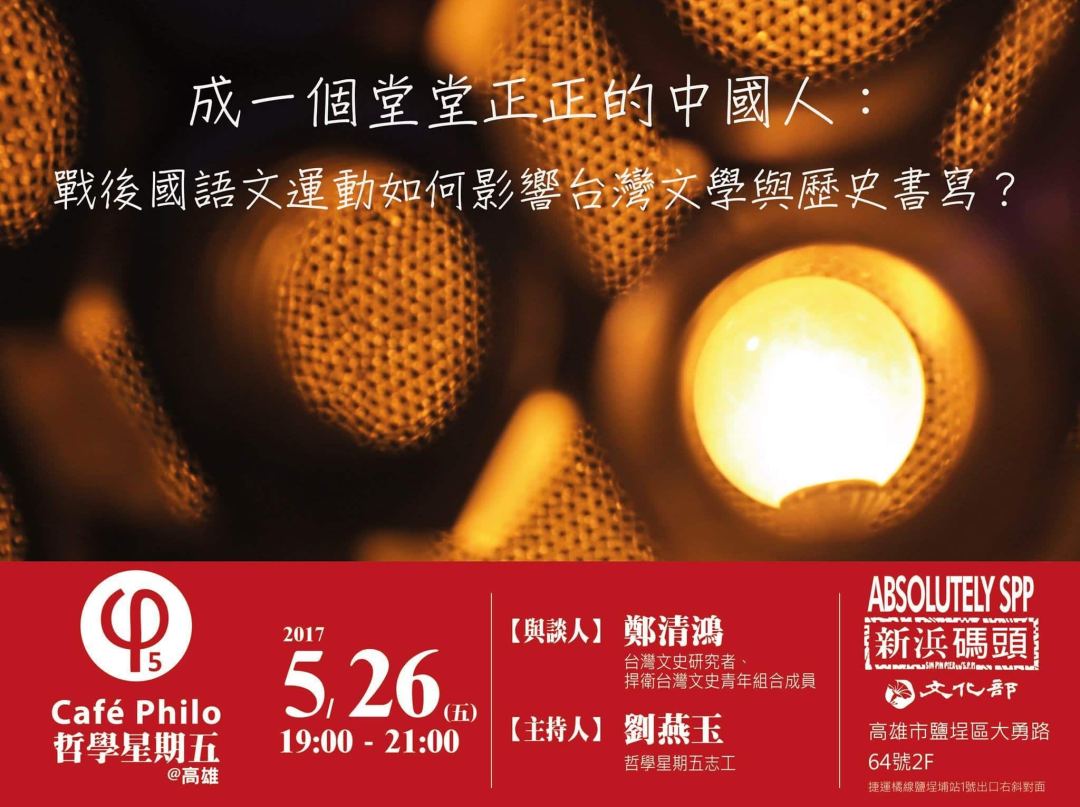 成一個堂堂正正的中國人:戰後國語文運動如何影響台灣文學與歷史書寫? 【哲學星期五@高雄】 【與談】鄭清鴻|台灣文史研究者、捍衛台灣文史青年組合成員 【主持】劉燕玉|哲學星期五志工 【時間】 2017 年 05 月 26 日(五)19:00 ~ 21:00 【地點】新浜碼頭藝術空間
