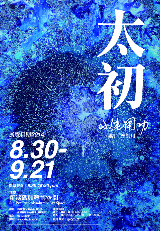 太初(Beginning) 藝術家:小純用功(林純用) 2014/8/30(六)~2014/9/21(日) 新浜AB展覽室、Pin-Bien館 茶會:2014/8/30 下午3:30 指導贊助單位:文化部